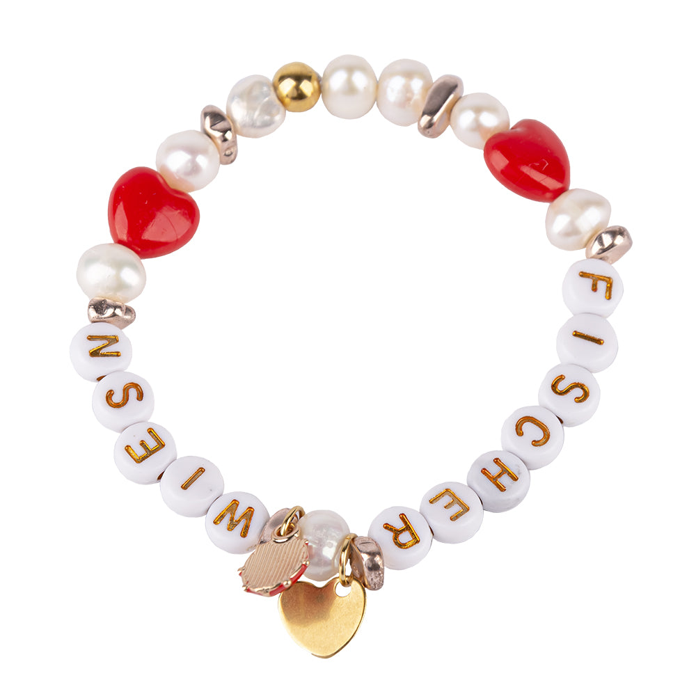 Perlenarmband „Fischer Wiesn“ mit roten Herzperlen, Süßwasserperlen und goldfarbenen Details. Mit Herz- und Marienkäfer-Charms – ideal fürs Oktoberfest und Trachtenoutfits.