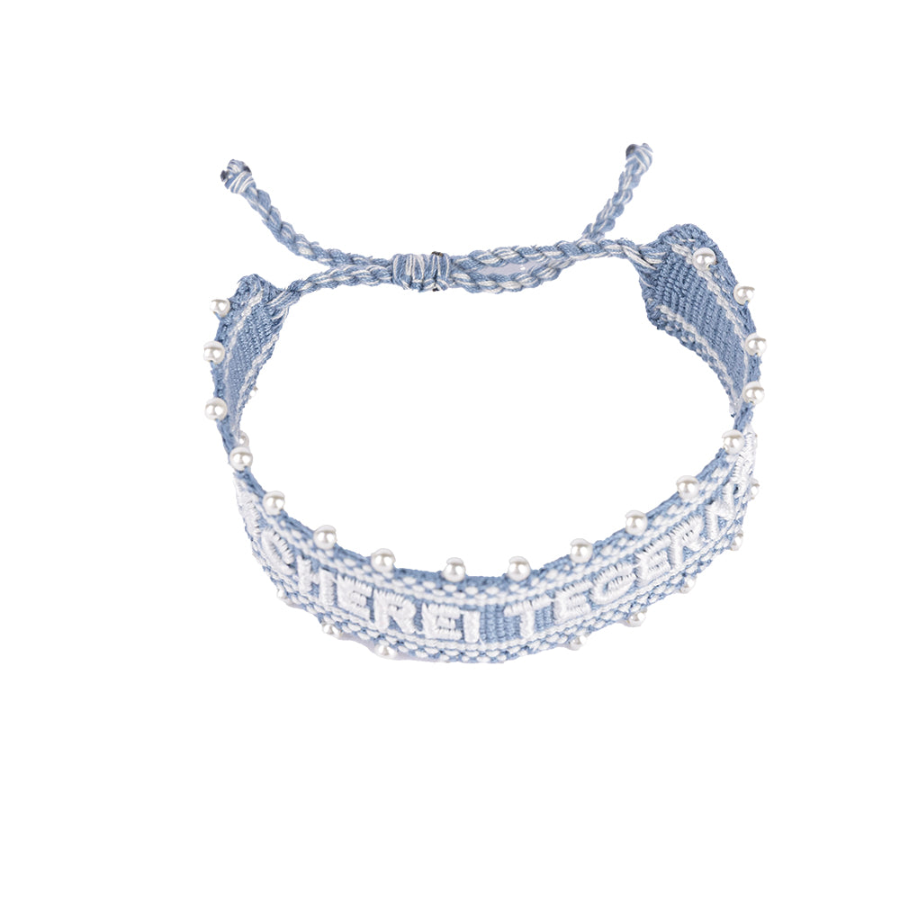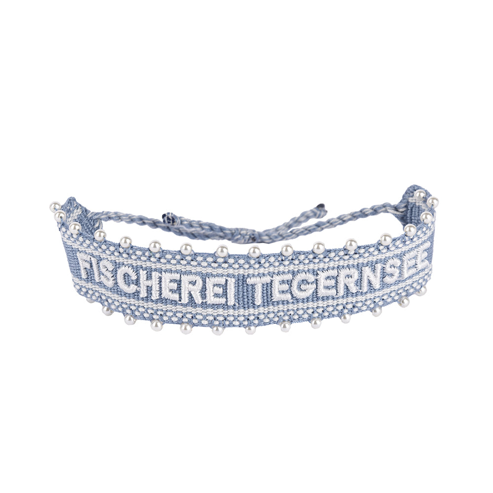 Handgewebtes Webarmband „Fischerei Tegernsee“ in Hellblau mit zarten Perlen und verstellbarem Zugverschluss. Maritime Optik – ideal als Geschenk oder Souvenir.